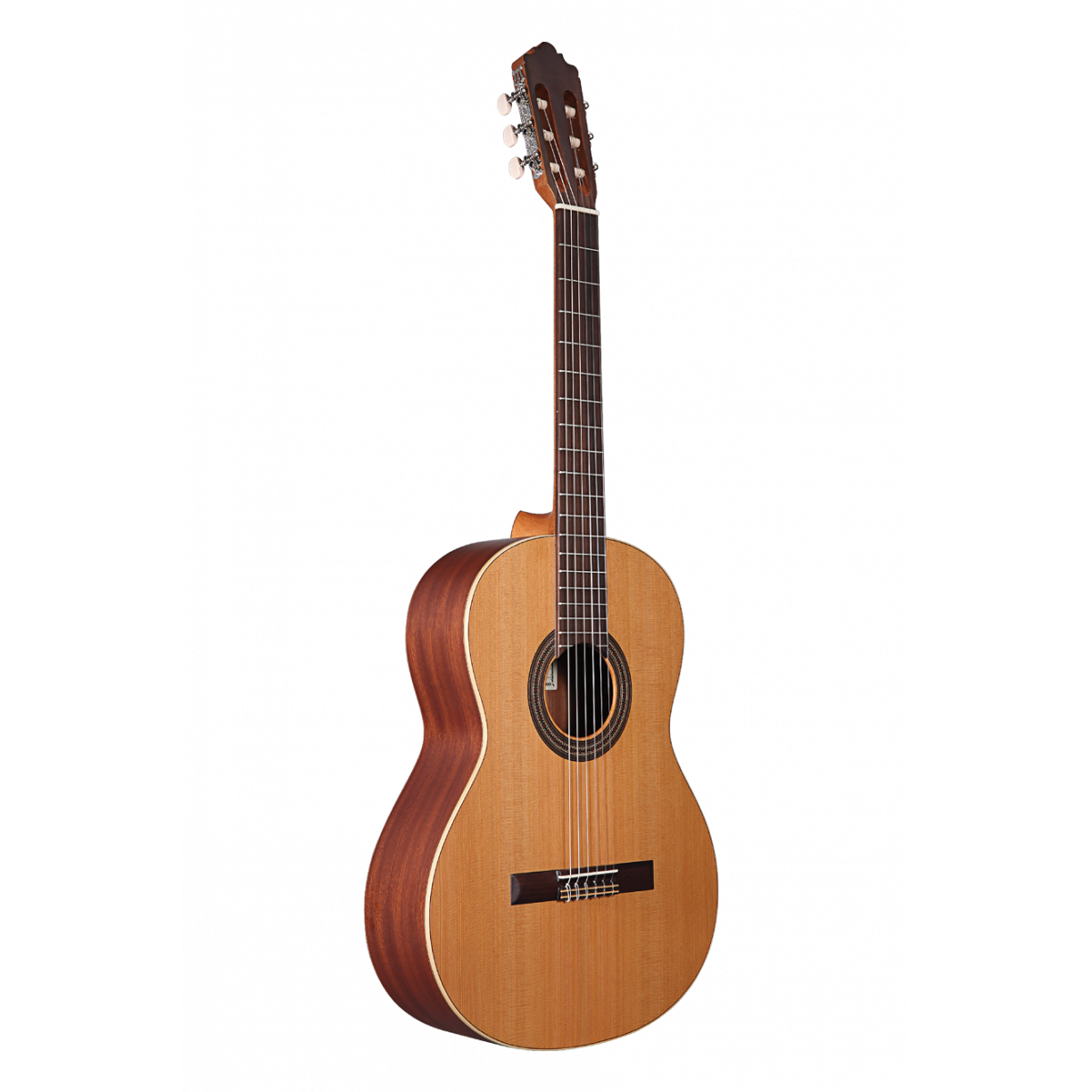 Our entry level guitar, suitable for beginners starting classical guitar lessons. This matte finish guitar has a punchy, immediate tone and simple minimal aesthetic, and features a quality solid top. The top of the guitar is the vital component for generating sound, vibrating as each string is plucked. With solid top guitars, the more this soundboard vibrates, the more this single piece of wood adapts and ‘opens up’ which improves the quality of sound as the guitar ages.