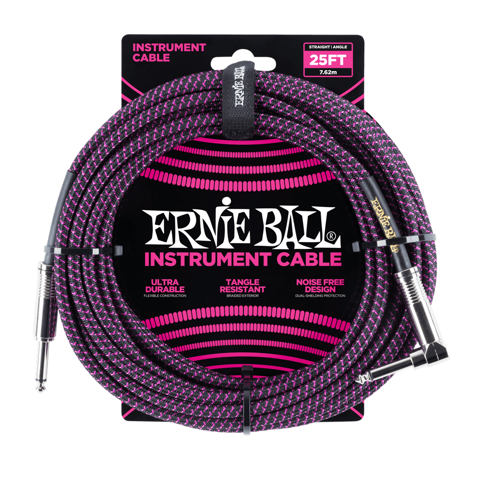 Ernie Ball instrument cables feature a high-quality design made with superior components that are built to last. Dual-conductors deliver reliably clear tone with crisp highs, tight mids, and rich harmonics. Multiple shielding materials preserve the signal with low handling noise, and the braided jacket exterior provides a tangle-resistant experience. Cable length 25ft (7.62m).