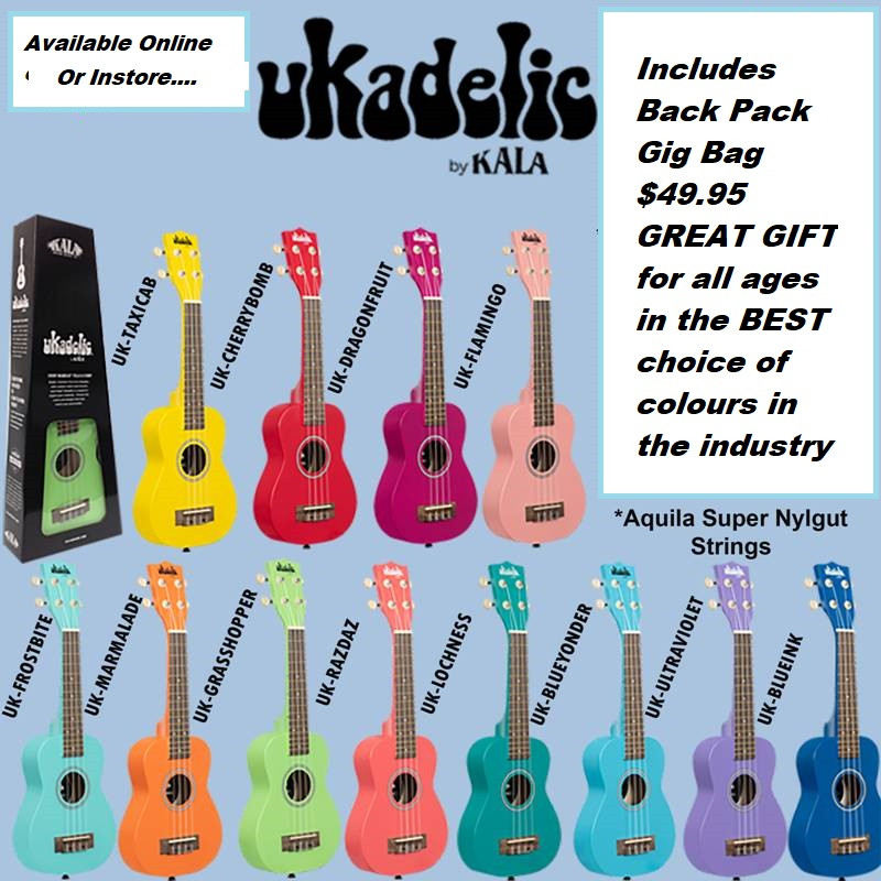 Made by Ukulele masters KALA these soprano ukes are a fabulous gift for any age. Complete with a backpack gig bag in the BEST range of colours ever in Uke history....